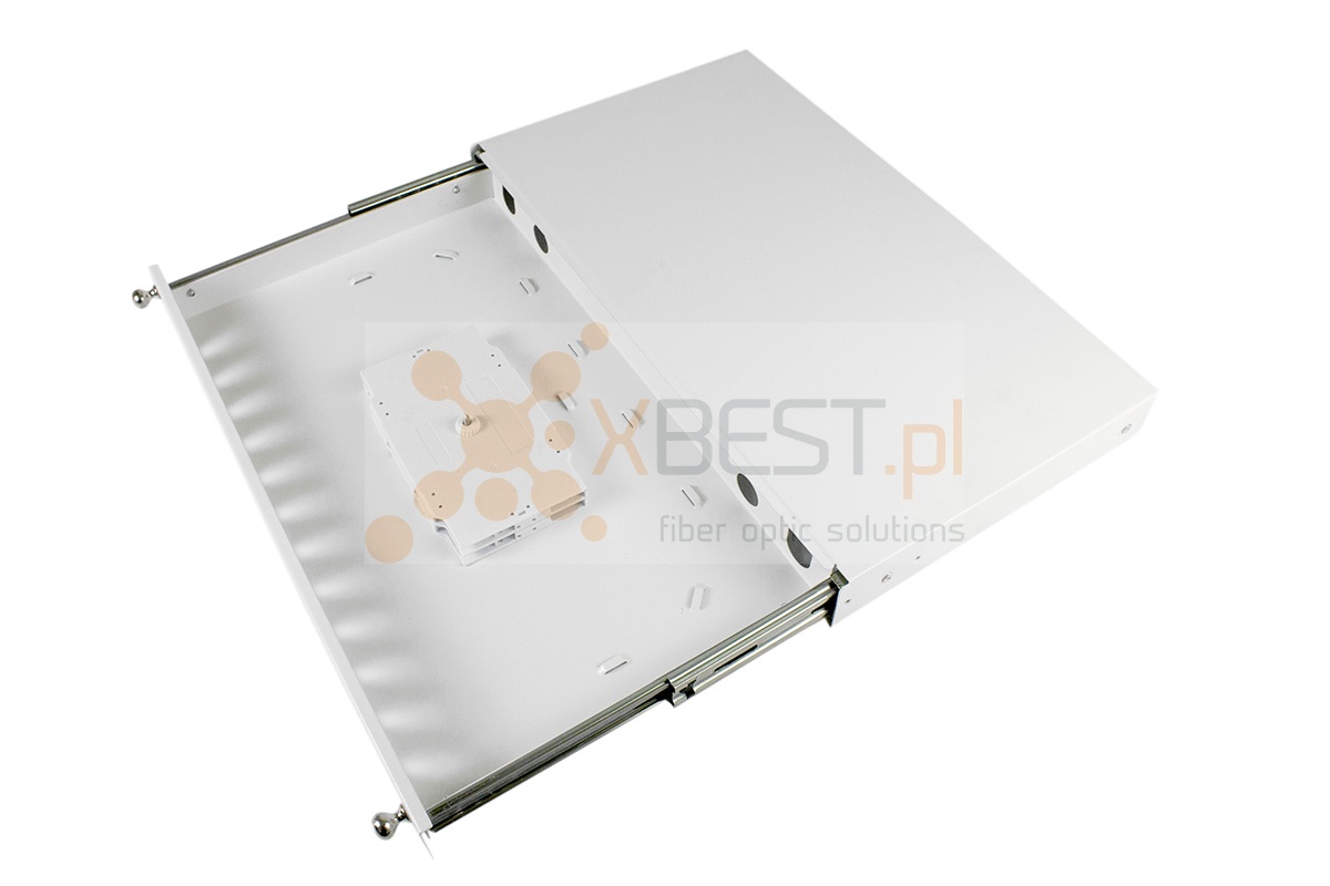 Przełącznica jest solidnie wykonana ze stali walcowanej na zimno i jest malowana proszkowo w kolorze białym. Posiada stopień ochrony IP41. Wygodna w obsłudze, wysuwana konstrukcja posiadająca blokadę otwarcia/zamknięcia zapewnia komfort pracy. Jest uniwersalnym rozwiązaniem dla realizacji dystrybucji urządzeń telekomunikacyjnych, serwerowni. Organizację włókien światłowodowych w przełącznicy ułatwiają tacki światłowodowe, które można dokupić osobno, dzięki czemu klient sam decyduje czy w ogóle są mu potrzebne i w jakiej ilości, wybierając ponadto w zależności od upodobań dowolny model tacki (na zdjęciach pokazany jest przykładowy, polecany zestaw - z tackami światłowodowa Tracom P4112 v.2 o nominalnej pojemności 12 spawów każda).