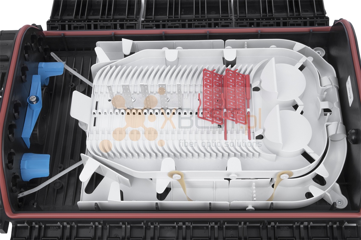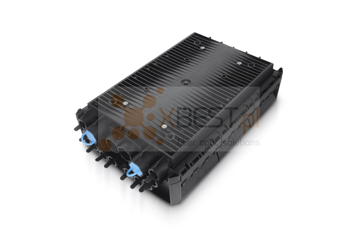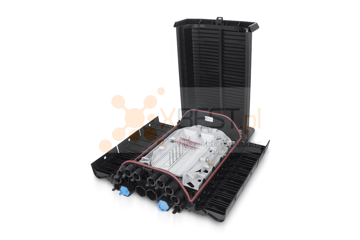 Mufo-przełącznica typu box służąca do ochrony splotów kabli światłowodu i aplikacji rozgałęziających. Posiada stopień ochrony IP68. Wykonana z wysokiej jakości tworzywa sztucznego co w połączeniu z wysoką wodoszczelnością sprawia że idealnie nadaje się do instalacji napowietrznych, kanałowych jak i doziemnych. Pozwala na zamontowanie do 28 tacek światłowodowych (do dokupienia osobno). Dodatkowo w zestawie znajdują się dwa panele na 12 adapterów SC Simplex / LC Duplex (SC Mount). Rozwiązanie tego typu pozwala na dostosowanie mufy do swoich własnych potrzeb.