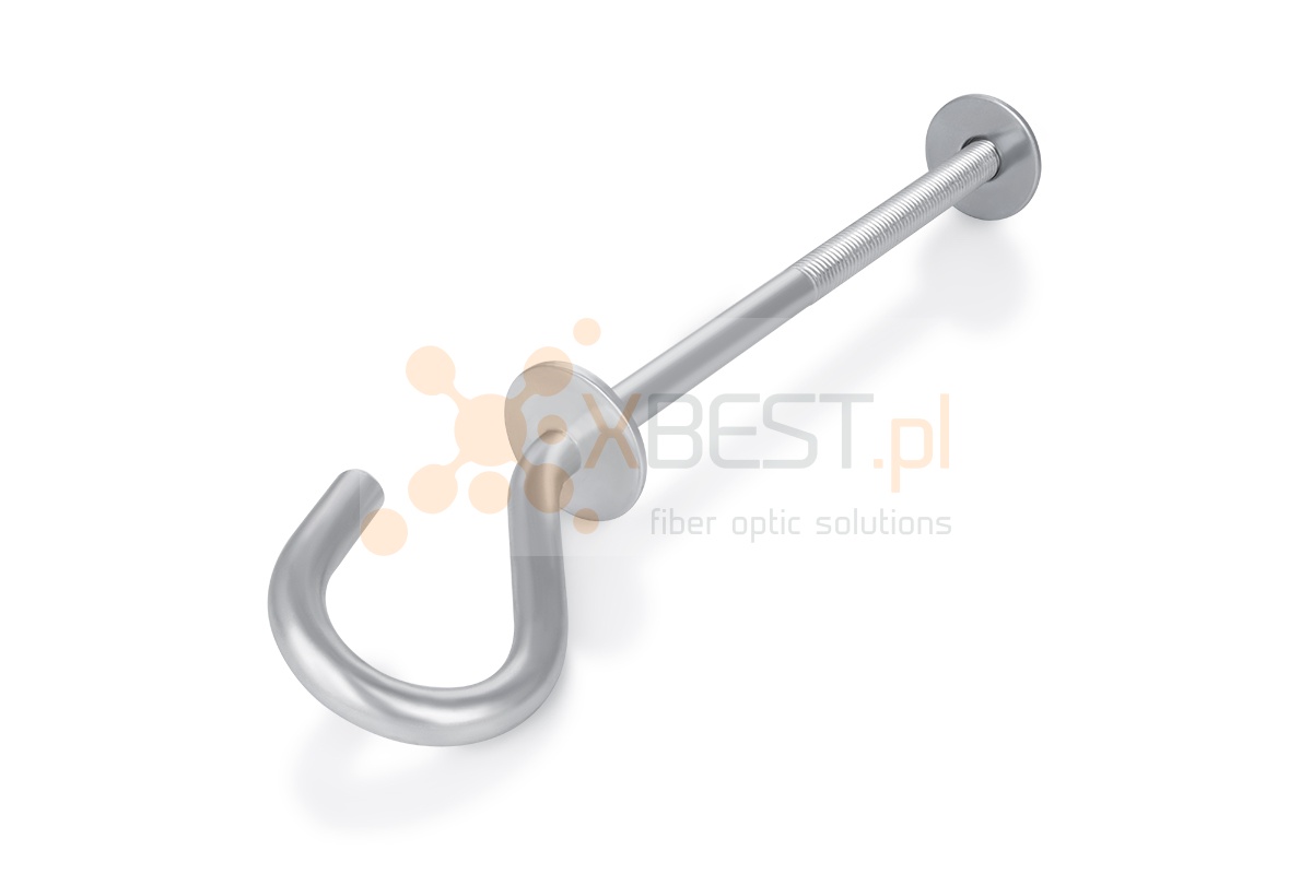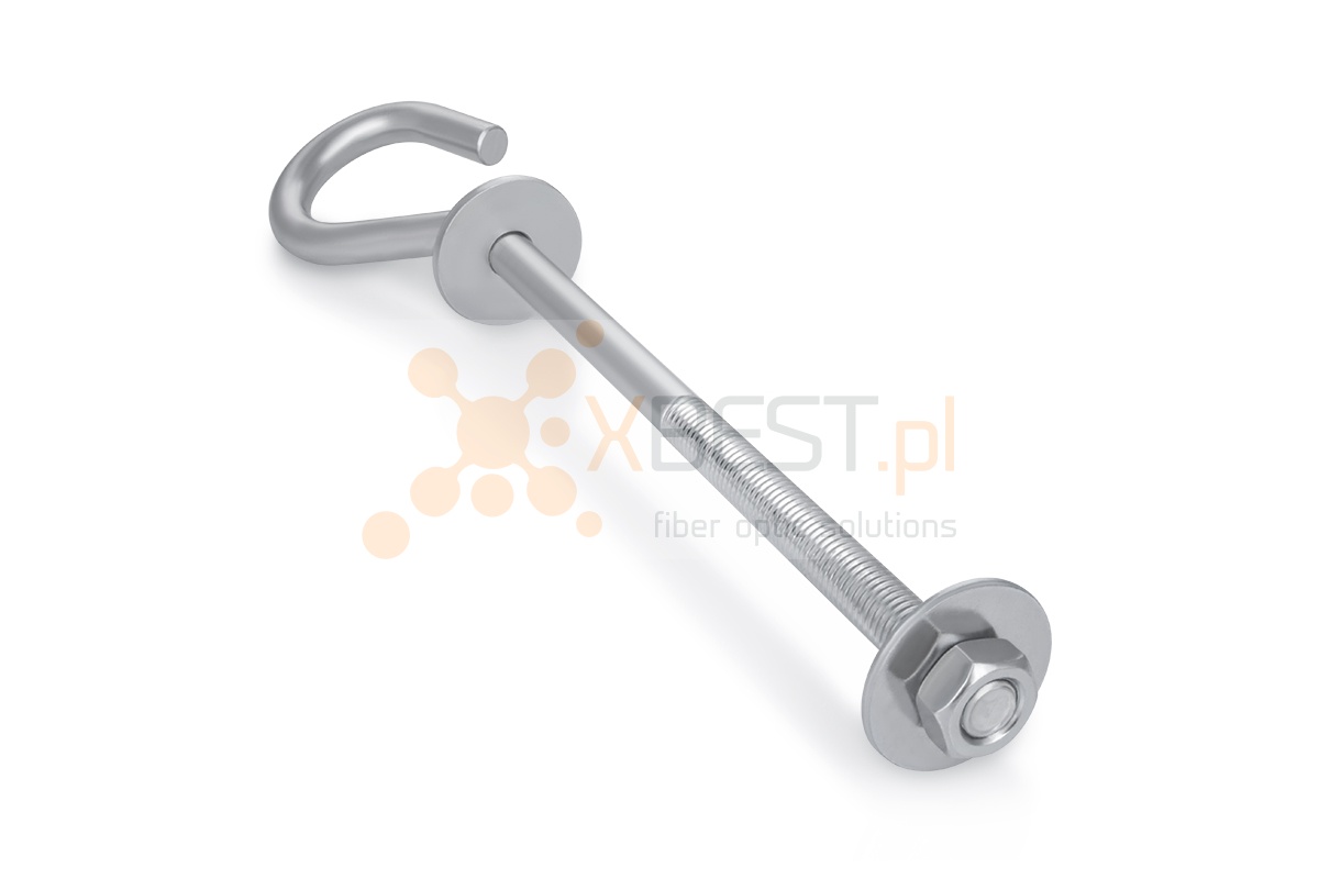Śruba hakowa M12x230 [mm] do wieszania uchwytów odciągowych i przelotowych mocujących samonośne przewody izolowane na słupach energetycznych lub na ścianach budynków. Solidna konstrukcja z wysokiej jakości stali ocynkowanej zapewnia odporność na szkodliwe warunki atmosferyczne.